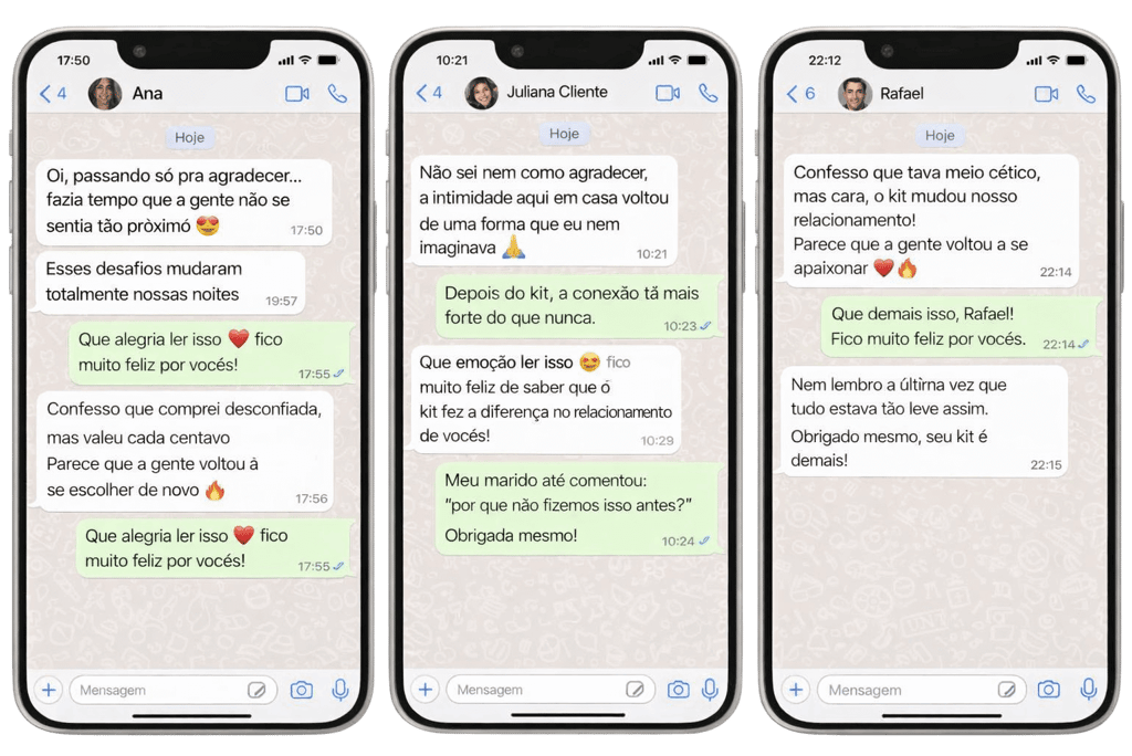 Além de a busca por saúde emocional e conexões profundas ser o tema que mais cresce na atualidade — sendo pauta constante de especialistas, psicólogos e grandes portais de bem-estar —, sabemos que quem ama de verdade não mede esforços para proteger o seu bem mais precioso. Assim como cuidamos da nossa saúde física, a "saúde do casal" virou prioridade máxima. Percebemos que as pessoas não aceitam mais viver no "automático" e estão investindo pesado para garantir que a chama com o seu parceiro(a) não apenas sobreviva, mas brilhe com a intensidade do início. Afinal, se você não mede esforços para ter sucesso na carreira ou cuidar de outros pilares da vida, por que deixaria o coração do seu lar — a sua relação — esfriar por falta de cuidado? O Kit Casal Sem Rotina é a ferramenta para quem entendeu que a felicidade a dois é o investimento que traz o maior retorno da vida.